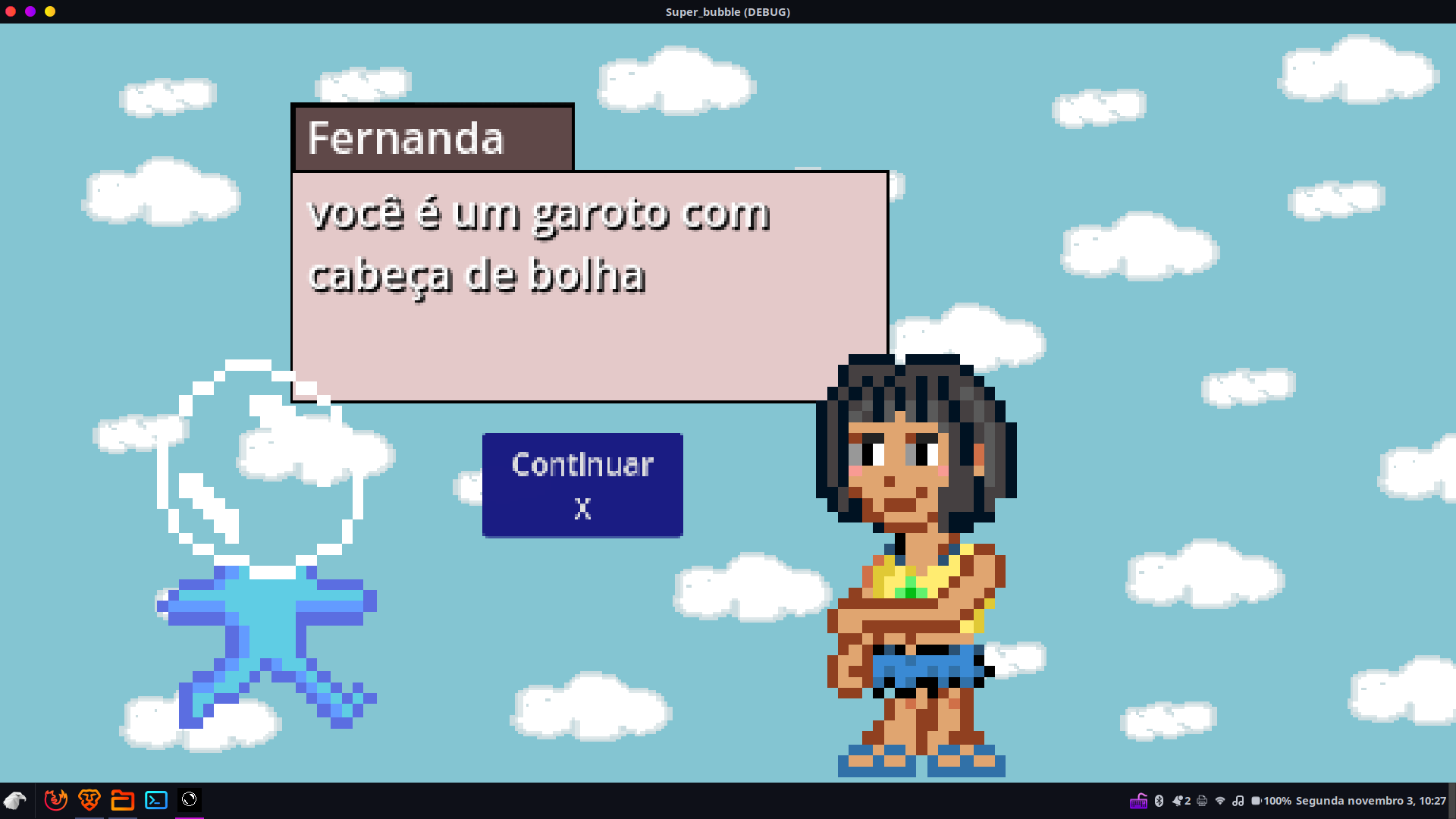 A bubble-headed boy wants to destroy a giant frog to save the universe. What matters is not his past but his future. The game is a platformer metroidvania like. If you want to laugh some time and try some funny game, here it is!